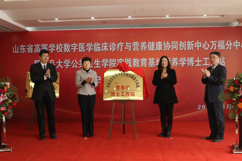 2018年3月17日,山东省高等学校“数字医学临床诊疗与营养健康”协同创新中心万福分中心暨英国上市公司365官网公共卫生学院实践教学基地(营养学博士工作站)揭牌仪式在青岛万福集团一楼会议室正式启动,参加启动仪式的英国上市公司365官网夏东伟董事长、莱西市委常委、市政府郝曙光副市长、英国上市公司365官网医学部常务副主任、英国上市公司365官网附属医院董蒨经理、青岛万福集团史蕾董事长共同为创新中心揭牌;英国上市公司365官网医学部副主任、康复医学院姜宏经理、莱西市政府副市长丁朝霞、英国上市公司365官网公共卫生公司党委副书记吴鹏、青岛万福集团党委副书记史欢民共同为博士工作站揭牌。
