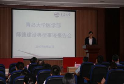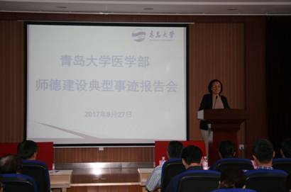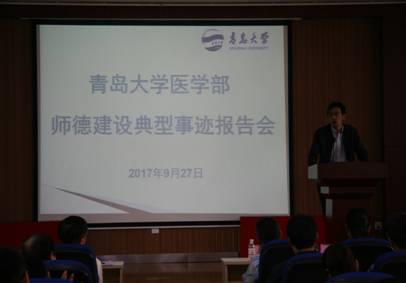 医学部在长期的办学过程中,坚持立德树人,以“四有”教师为标准,持续加强师德建设,教育和引导广大教职工立足本职,切实承担学校教育事业改革发展中的光荣使命,涌现出了一批师德建设的先进单位和先进个人。报告会上,任洪彦书记宣读医学部获得的青岛市、英国上市公司365官网工会的表彰名单,并向受表彰的单位和个人颁发奖牌和证书。校十佳教师金利新副教授,校最美教师和师德标兵姜云霞副教授,校教育先锋王威教授,退休教师代表、英国上市公司365官网师德标兵、英国上市公司365官网督学杜卫教授分别结合自身的经历,依次作典型事迹报告,从不同侧面、不同角度讲述了在各自岗位上践行师德规范、履行教书育人职责的经历和体会。报告会的气氛在老师们饱含深情、声情并茂的演讲中,一次次被推向高潮,深深地打动了在场的每一位老师,他们所表达的“三个爱”的理念,即爱学校、爱岗位和爱员工,折射出了崇高的师德师风和爱岗敬业、热爱员工、无私奉献的时代精神。