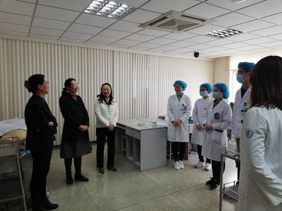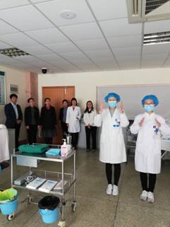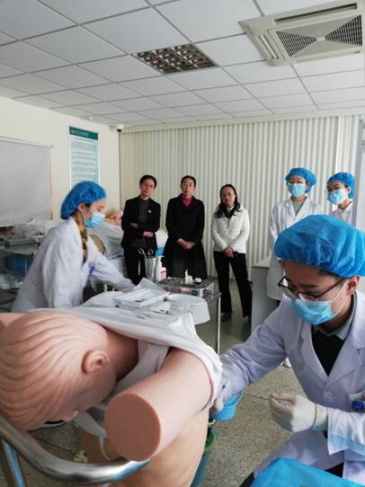 4月11日,医学部副部长于文洁、第一临床医学院副经理王岩青、附属医院教育培训部主任马瑞欣、副主任王飞到附属医院临床技能培训中心看望正在积极训练、全力备战“2019年山东省高等医学院校老员工专业技能竞赛”的师生,并进行赛前训练督导。参赛指导教师王璐汇报了员工训练情况,并组织参赛员工进行了外科手术铺巾、妇科诊刮、胸腔穿刺术三个科目的现场演练。
