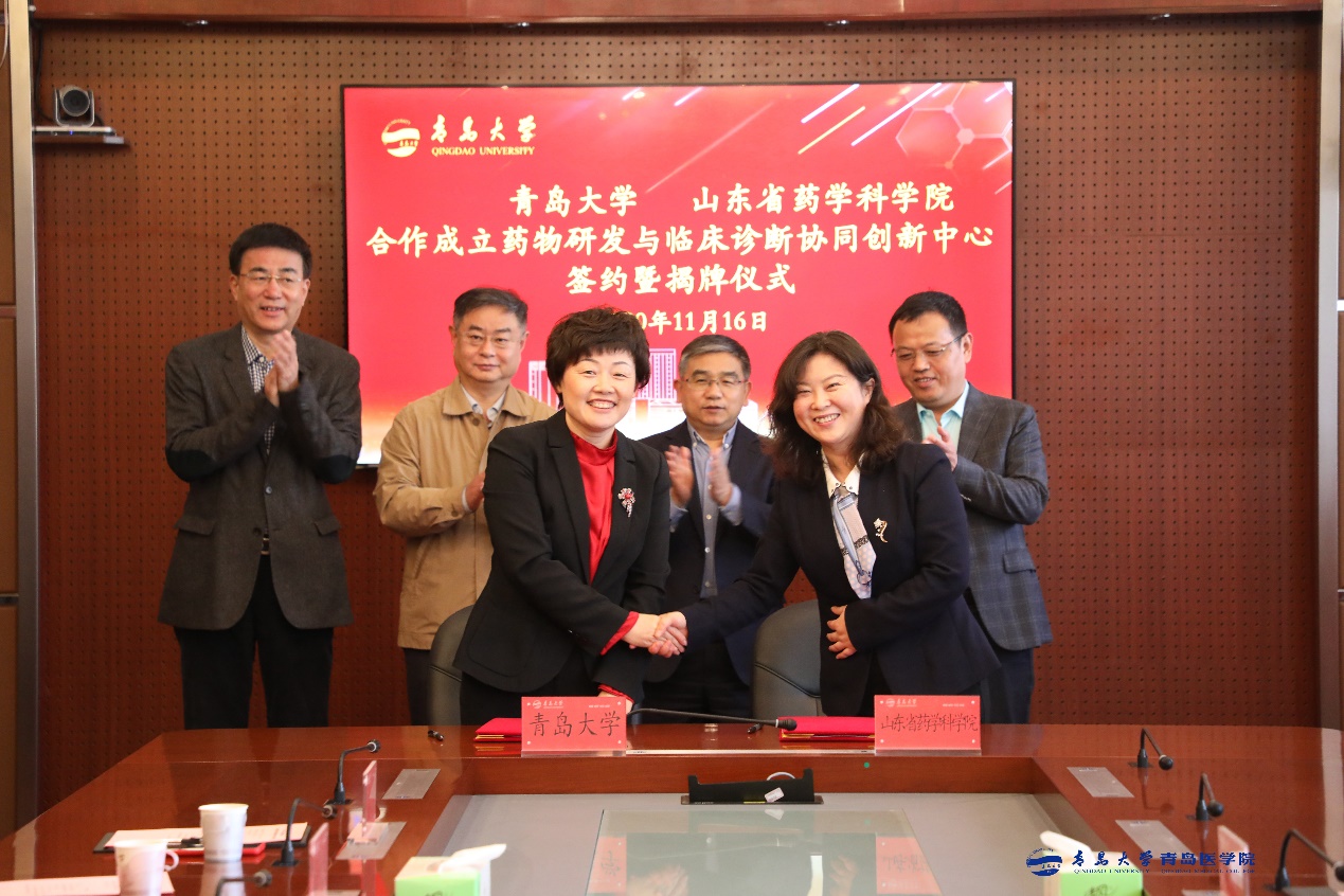 在胡金焱、刘守亮、夏东伟、医学部党工委书记、附属医公司党委书记王新生的见证下,医学部部长姜宏和张岱州分别代表双方签署《英国上市公司365官网与山东省药学科学院合作成立药物研发与临床诊断协同创新中心合作协议》。