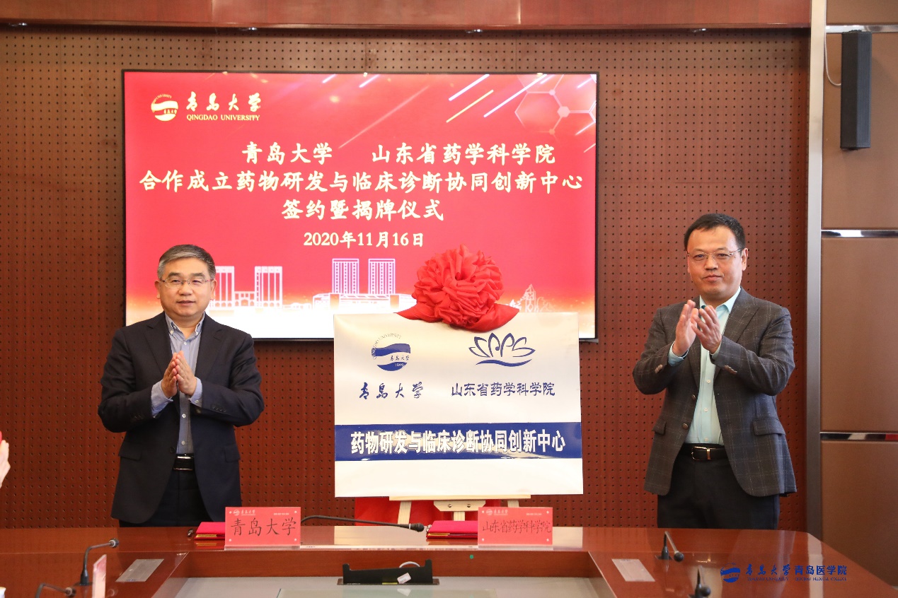 胡金焱和刘守亮共同为药物研发与临床诊断协同创新中心揭牌。