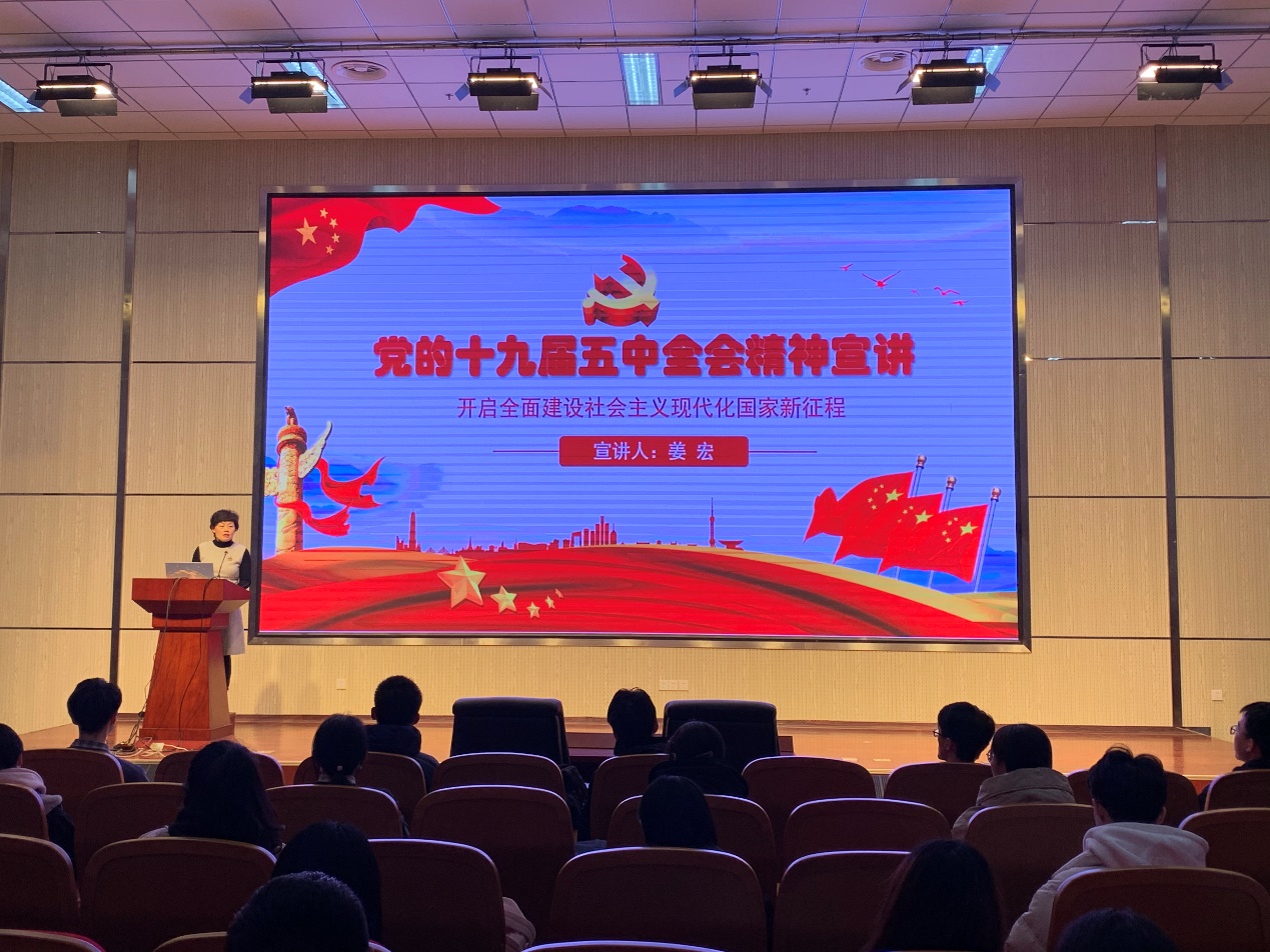 为深入学习宣传党的十九届五中全会精神,贯彻落实学校《关于深入开展党的十九届五中全会精神宣讲工作的通知》要求,12月1日晚,医学部党工委副书记、部长姜宏在浩园医学教育综合楼学术报告厅为2018级临床八年制01班和2019级药学01班员工宣讲党的十九届五中全会精神。
