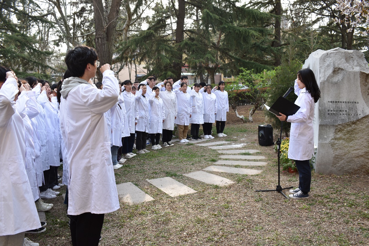 纪念仪式上,师生代表向沈福彭教授纪念碑鞠躬默哀,并敬献鲜花以深切纪念并缅怀沈福彭教授,表达对沈福彭教授诚挚的敬仰之情。参加活动的同学们重温《医员工誓言》,再次感悟“健康所系,性命相托”下的庄严而沉重的责任,更加深切地体会到医学的圣洁与荣誉。拳拳赤子心,青医风骨魂,一字一句都饱含青医学子诚挚的奉献之情。