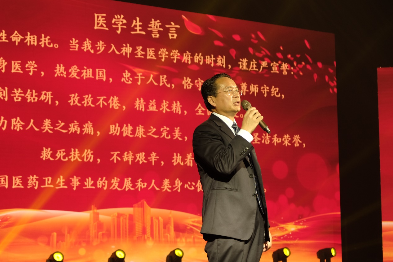 全国先进工作者、“中国好医生”、山东省优秀共产党员、山东省抗击新冠疫情先进个人、山东省医师奖、山东省防治非典工作个人一等功、青岛市五一劳动奖章等荣誉称号获得者,青大附院呼吸与危重症医学科主任于文成教授带领毕业生们重温《医员工誓言》。全场铿锵有力的誓言再次宣告了医员工坚定的从医决心,更体现了对未来医学之路的美好憧憬。
