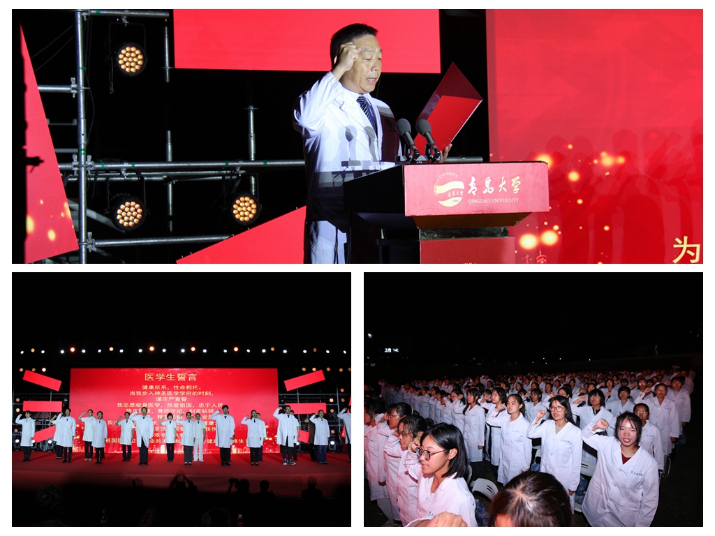 李永春领誓,全体新生起立共同宣读《医员工誓词》。“健康所系,性命相托”、“为祖国医药卫生事业的发展和人类身心健康奋斗终生”,嘹亮而坚定的声音在体育场上空回响。从此,他们有了一个共同的名字——青大医学人。