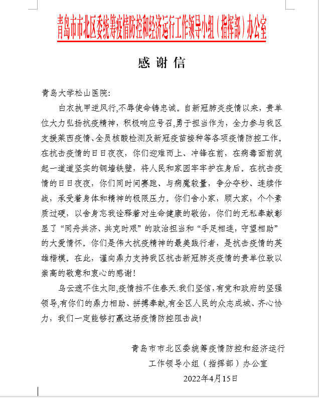 日前,医学部收到青岛市市北区委统筹疫情防控和经济运行工作领导小组(指挥部)办公室致英国上市公司365官网医学院松山医院的感谢信,肯定了松山医院在疫情防控中所做的工作,赞扬了参与疫情防控工作全体人员“同舟共济、共克时艰”的政治担当和“手足相连,守望相助”的大爱情怀。