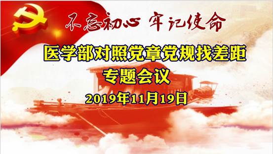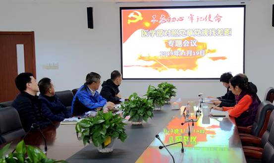 根据医学部“不忘初心、牢记使命”主题教育实施方案要求,11月19日下午,医学部在浩园医学教育综合楼215会议室召开对照党章党规找差距专题会议。会议由医学部常务副书记王有全主持。医学部班子成员参加专题会议。